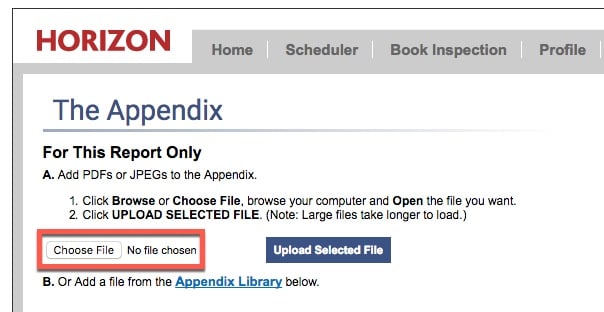 The Appendix button lets us attach other documents to our report. These can be photographs or scanned documents.