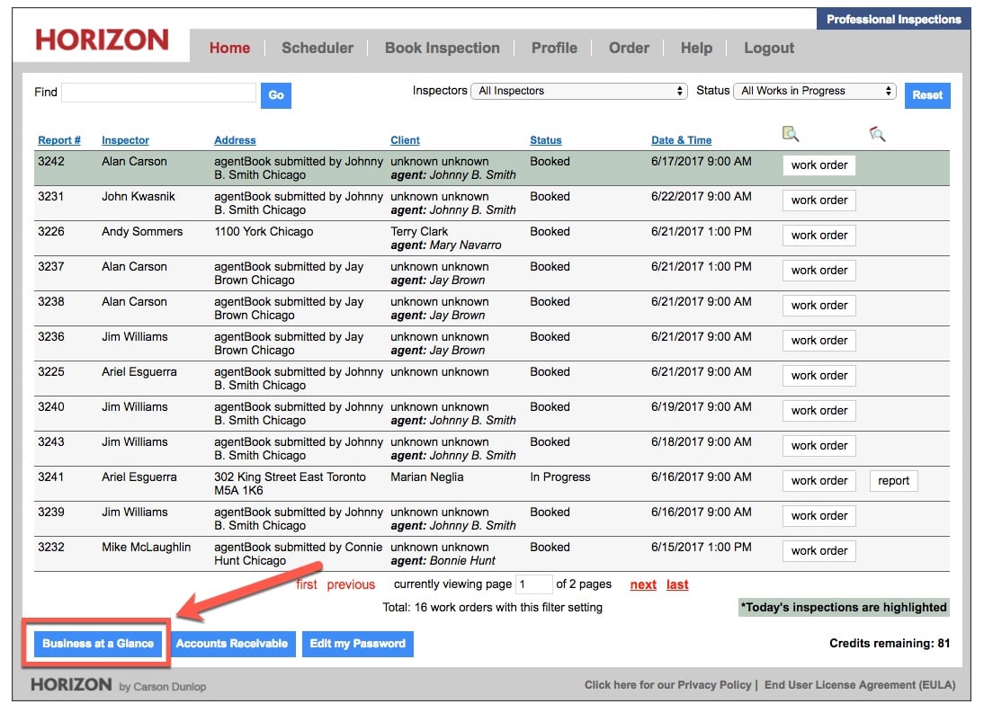 Business at a Glance is a tool designed to keep you on top of your business. Are you doing more inspections than last year? What types of inspections are generating most of your revenue? How many inspections is each inspector doing?