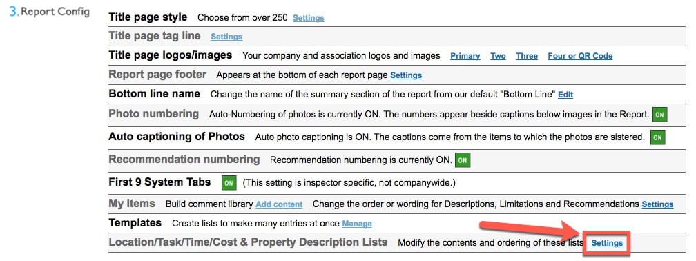 1) From the Profile go to section 3. Report Config > Location/Task/Time/Cost & Property Description Lists > Settings.