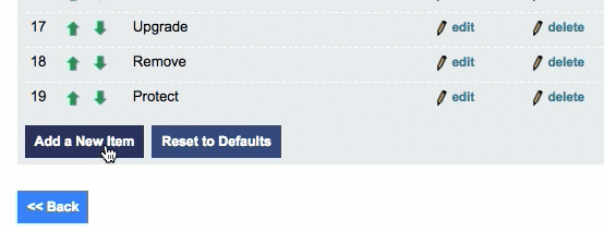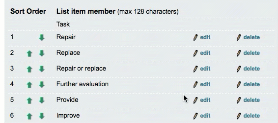 Note: The Green arrows on the left let you move items to change the display order. Click on the edit or delete icons to make changes or remove items from the list.