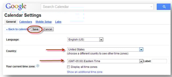 2. On the Calendar Settings screen select Country, then your current time zone. Click Save to complete. (Figure 1)