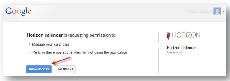 8. Give Horizon permission to manage Google Calendar. Allows your inspections to sync to Google. Click Allow access. (Figure 5)