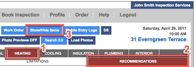 To hide these categories, first navigate to the Heating section of any Report, followed by Recommendations. Once in this area, click the blue “Show/Hide Items” button near the top of the screen.