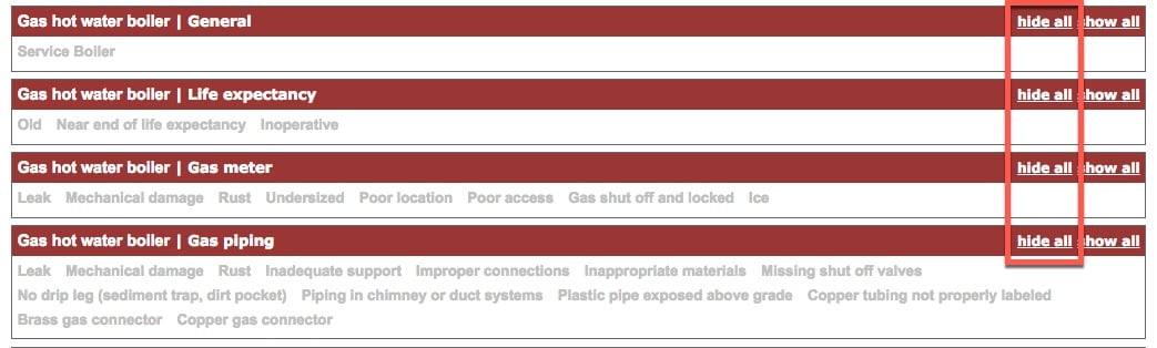 You will see a list of all the Heating Recommendation categories. Scroll down to the start of the Gas hot water boiler categories. If you would like to hide the entire section, click hide all. In this example we have hidden the first 4 Gas hot water boiler categories.
