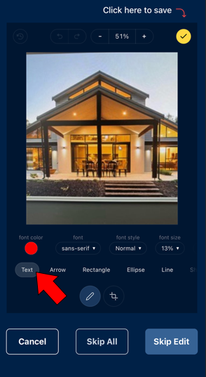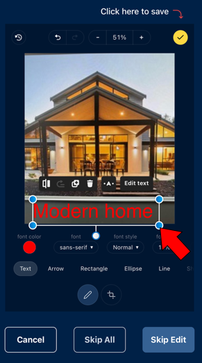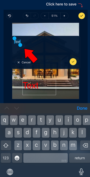NOTE: If you'd like to make adjustments to the text, please place your finger on one of the blue dots of the text box and update the location, and size.