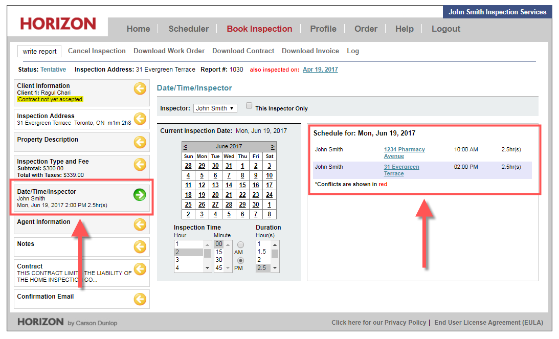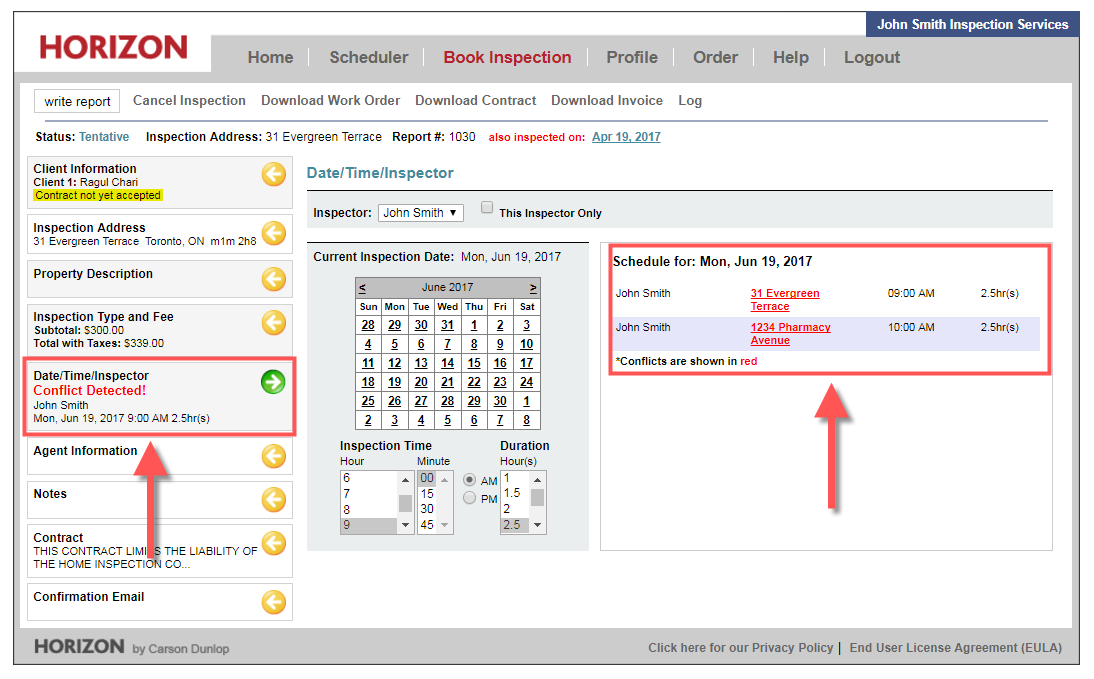 1) We booked this inspection without looking at the Scheduler, and Horizon is telling us we have double booked ourselves. (Figure 1)