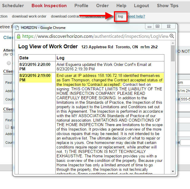 In Horizon we make it super easy to find out when your client accepted the contract. Simply go into the Work Order of the inspection, and click on the ‘log’ button near the top of the screen. A popup window will show you time stamps of actions taken within the work order. One of the time stamps will show the time and I.P. address that the contract was accepted from. It will also show where the client identified themselves by name. It’s actually more valid than a physical signature since it can’t be forged!