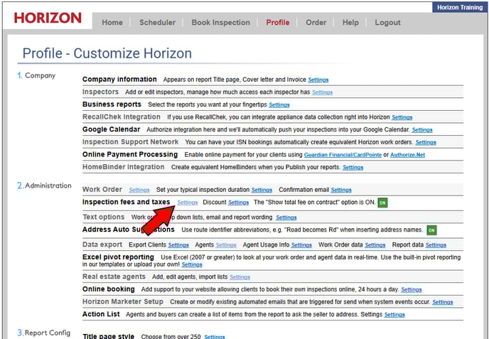 2. In ADMINISTRATION, select "Settings" beside "Inspection Fees and Taxes"