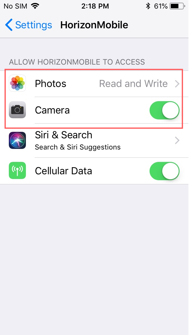 In Horizon Mobile on iOS, if you can't take a photo, please ensure that your Horizon Mobile Permissions are changed.