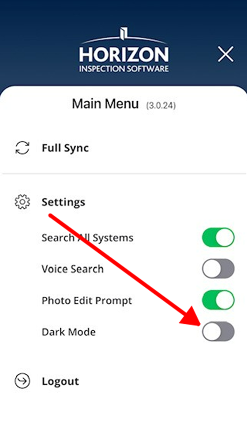How to Switch to Dark Mode on Horizon Mobile 3 Please follow these steps to switch to dark mode on Horizon Mobile 3 1. Tap the Hamburger menu at the top left of the home screen. 2. Tap the Dark Mode button to put Horizon Mobile into Dark mode. 3. Now the screen will display in dark mode.