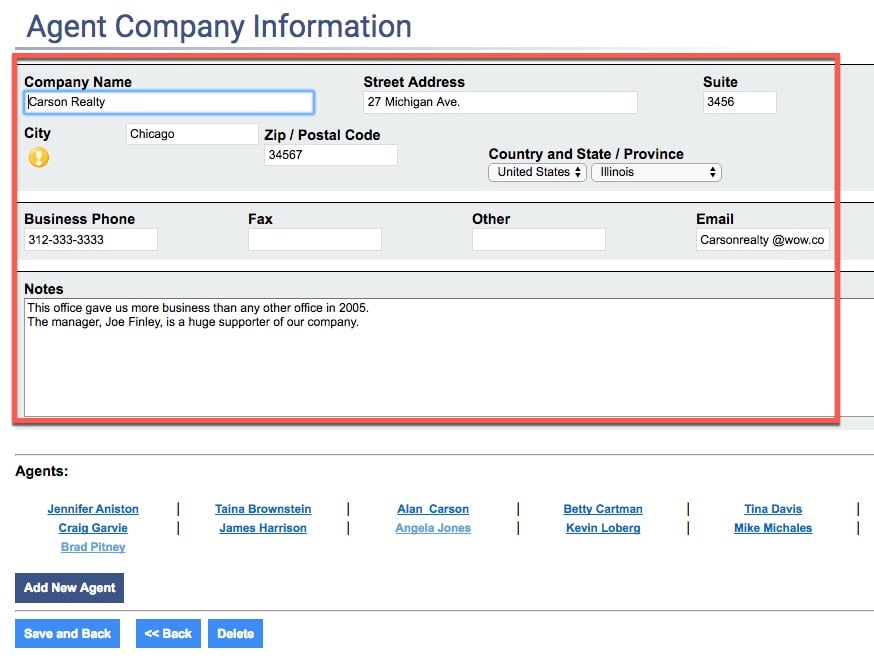 5) We’ll get some more details and a list of agents from that company. We can edit any information and click Save and Back to retain it.