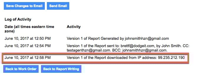 As an Inspector, you will know your own IP address. When the Report is downloaded by a different IP address, you will know that your client downloaded the Report.