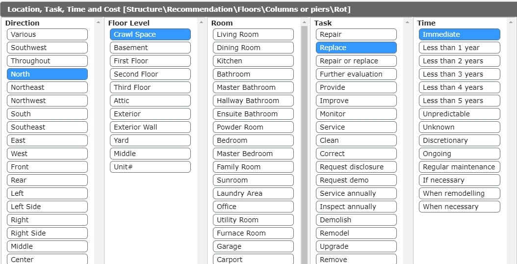 We record the Condition and describe the location as Crawlspace, which is under Floor Level on your Location, Task, Time, and Cost screen.