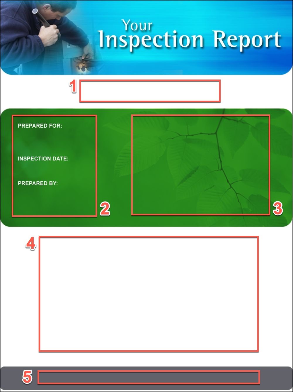 Your design will need to respect predetermined spacing provided for inspection address, client information, feature home image, company information and spacing for four logos.