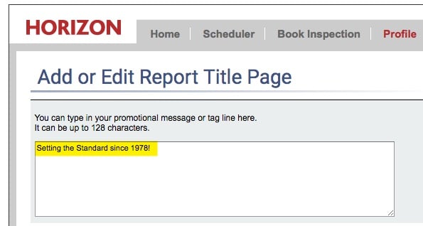 1) Navigate to the Horizon Profile and go to 3. Report Config > Title page tag line > Settings.